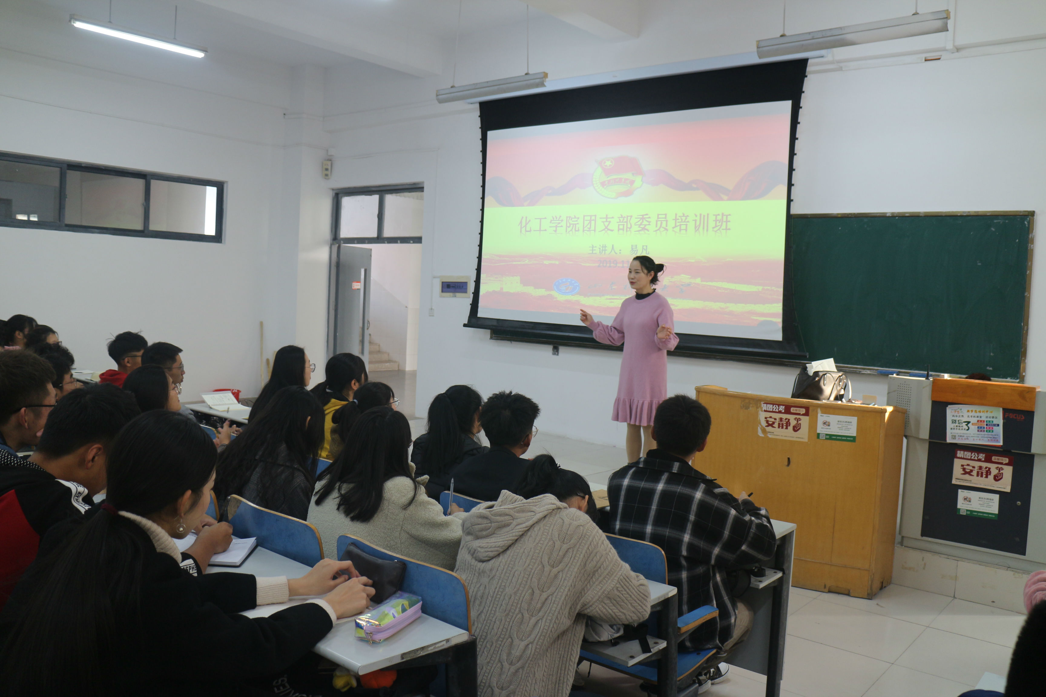 在J5-302举办团支部委员培训班。团委书记易凡、辅导员李玲玲、许婷婷、诸葛长华担任培训班主讲,他们分别结合自身经历以及团支部工作的具体问题,为在场学生做了经验分享,并提出方法建议。各班团支部委员参加此次培训班。