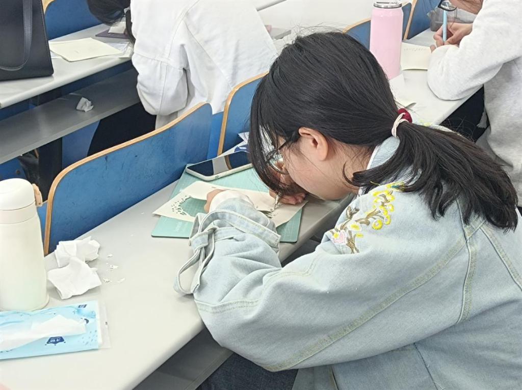 刀下飞花剪纸社举办了“纸上雕花,邂逅光影”第二期活动,此次活动由剪纸社社长胡洁主持,主要内容是学习制作纸雕灯。活动伊始,胡洁首先向在场同学科普纸雕灯的相关知识,她介绍纸雕灯是一种利用剪纸的镂空技术,通过不同层的剪纸作品的叠加,形成的一种剪纸工艺品。随后,胡洁向在场同学展示制作纸雕灯需要用到的材料工具,同时介绍使用剪纸工具时要注意的几点事项。科普结束后,主持人给大家提供剪纸模板进行制作学习。大家互相交流学习,讨论纸雕灯的制作技巧,其乐融融,在一刀一刻中体验纸雕灯的乐趣,领略到非遗剪纸艺术的魅力火花,体现出刀下飞花剪纸社的和乐氛围。