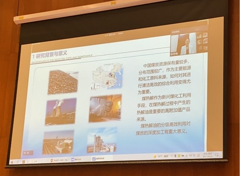 在离子液体萃取分离煤热解油中高附加值组分领域所做出的前瞻性研究进展和一系列研究成果。由于疫情管控的原因,徐冬梅教授应允采用录播和腾讯会议互动的方式进行会议报告,取得了良好的交流效果,圆满地完成了本次邀请报告。