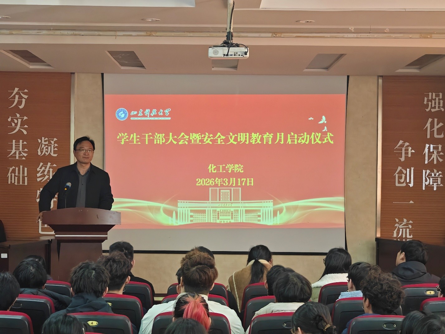 育人体系中的重要意义,他宣布把每年三月定为学院安全文明教育月,相关活动正式启动。他指出,安全是发展的基础,文明是成长的底色。全体师生必须始终绷紧安全弦,践行文明行为。他强调全体学生干部要主动担当、积极作为,将安全文明工作“扛在肩上、抓在手上”,共同营造安全、文明、和谐的育人环境。随后,易凡、李玲玲、孙梦柯分别就实验室安全、学生心理健康教育和田径队员运动安全防护提出了具体要求。
