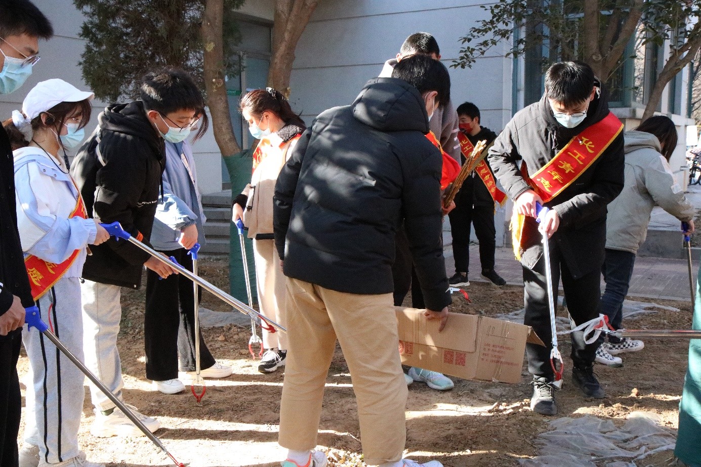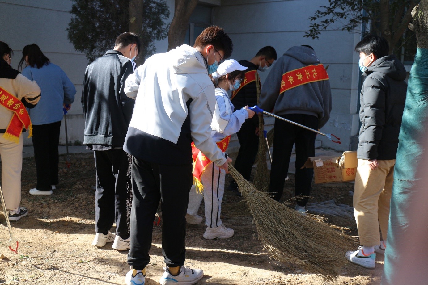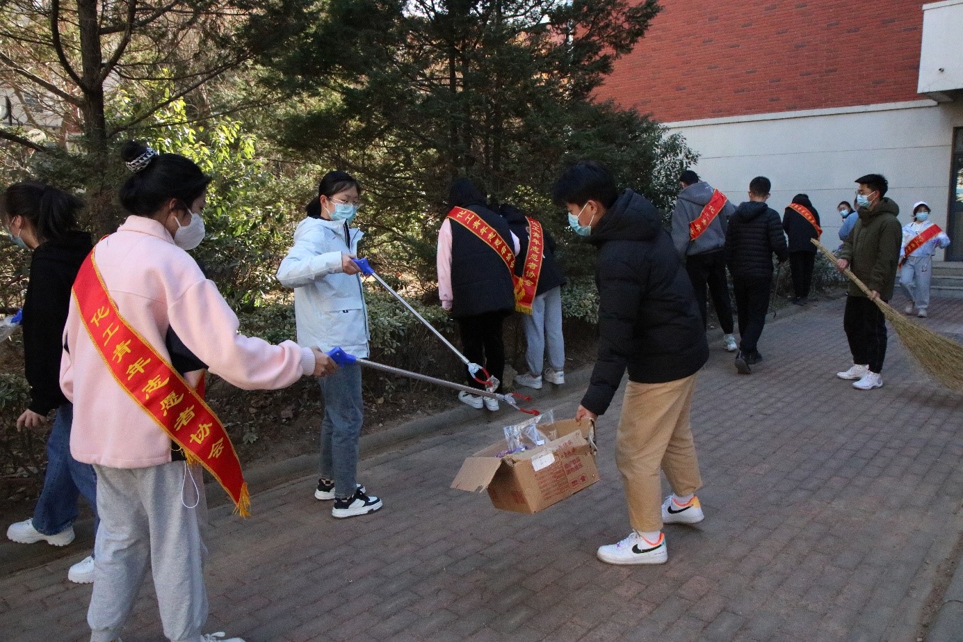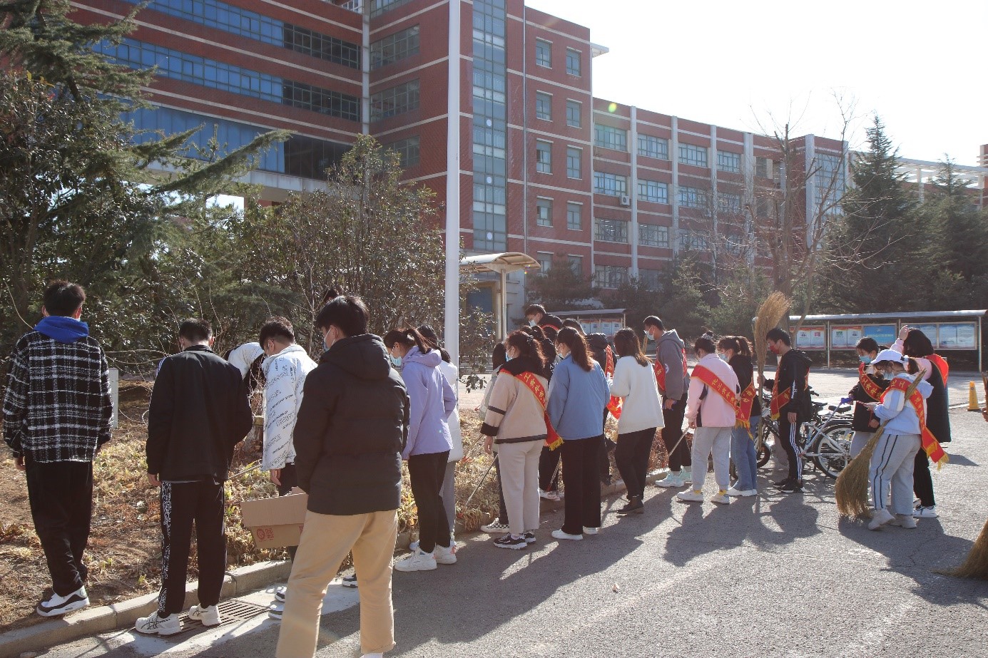 开展“学雷锋”志愿清扫活动,组织学生志愿者在校园内进行卫生清扫。