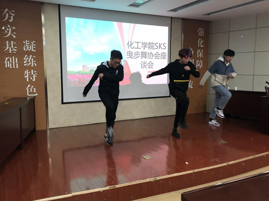 活动伊始,徐老师与协会会员交流了近期训练情况,对社团目前活动推进存在的困难进行了探讨,并给出了合理建议。徐老师对社团过去的发展给予了充分的肯定,他说到,SKS曳步舞协会是一个街舞社团,相较于其他组织更活跃也更自由,有着很强的场面控制能力,希望社团能够再接再厉,砥砺前行。随后,协会会长陈庭帅、副会长陈颖涨、张广龙在现场为大家献上一段曳步舞表演,现场掌声不断,气氛达到高潮。会员们纷纷表示,老师的话令自己深受鼓舞,精彩的表演加深了自己对曳步舞的喜爱,今后即使训练很苦很累,也一定会坚持下去,不忘初心。活动在轻松愉快的氛围中圆满结束。
