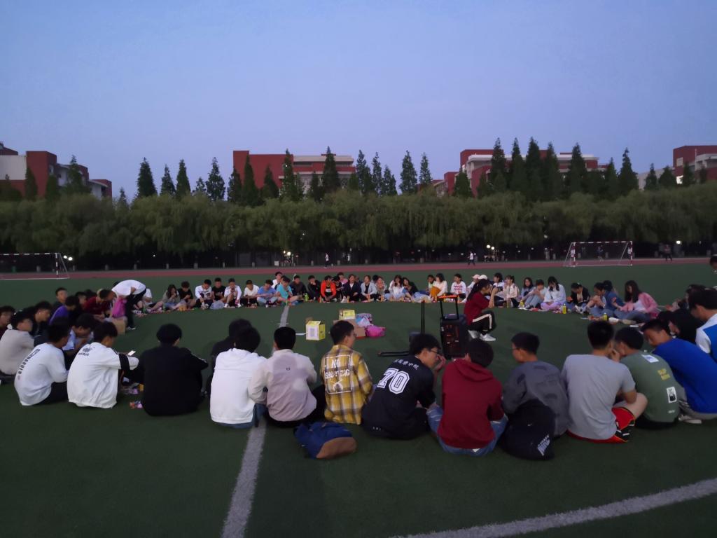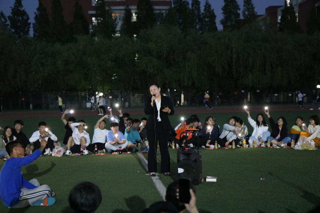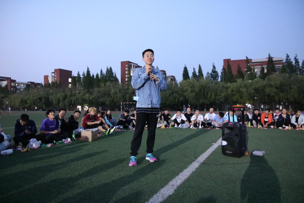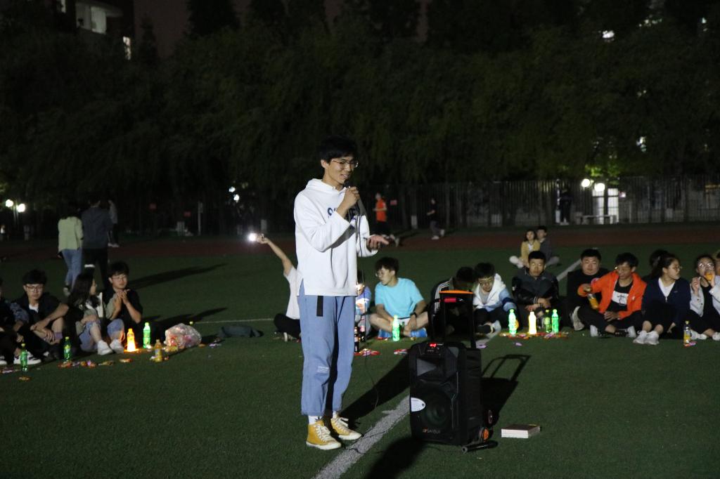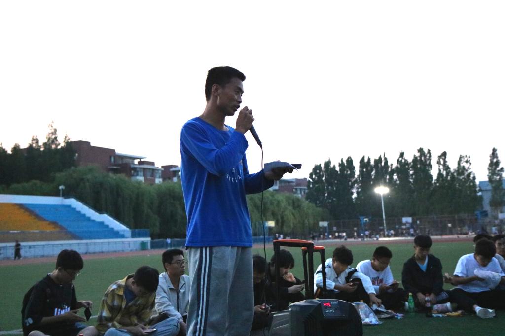 夜幕初起,老师和同学们在谈笑之间围成了一个圈,把圆圈中间作为舞台。19:00,主题团日活动开始,主持人李彦钊首先发表了一段关于本次校运会再获双冠暨甲组十连冠乙组十年九冠的总结,他的讲述激情澎湃,引发同学们回忆起一周前的运动会,激发了大家的真情共鸣。随后,他请出了为运动会提供主力后勤保障服务的狂人小说