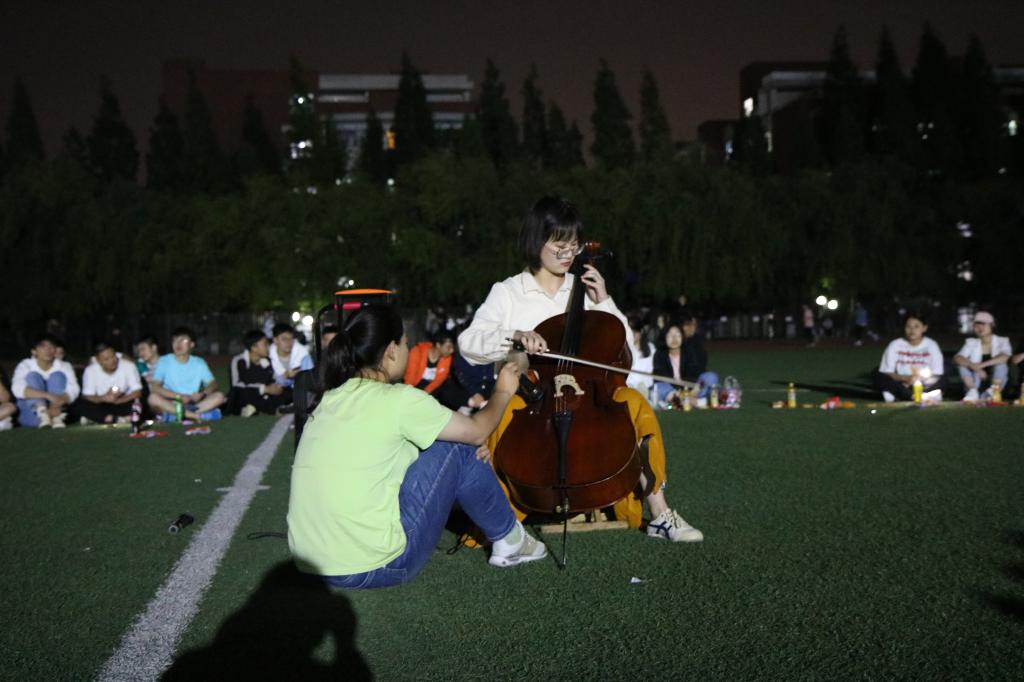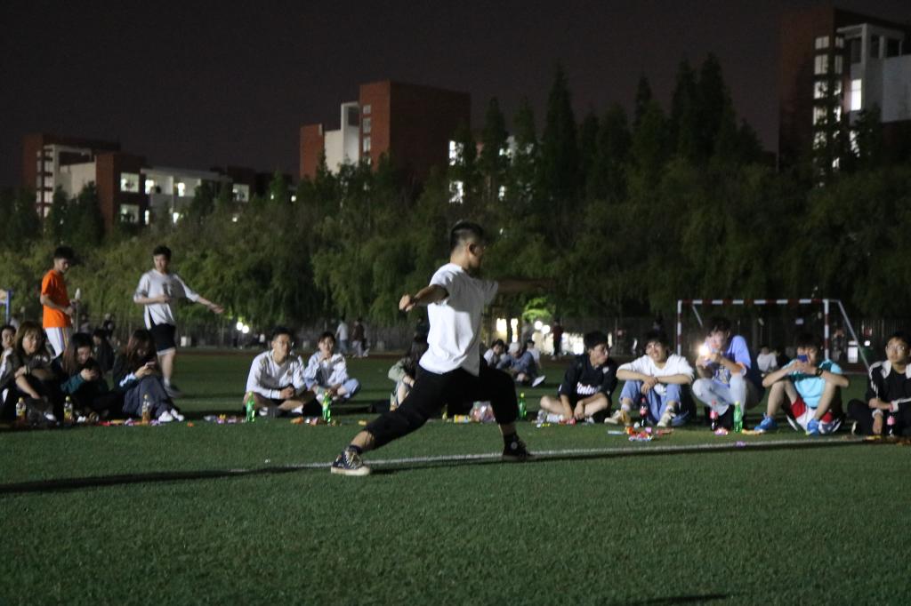 留学生表演结束后,主持人宣布团日活动进入团支部成员表演环节,团支部成员孙铭泽大提琴独奏《lemon》《我和我的祖国》,悠扬的琴声随着夜风,流进了每一个人的心里;王阳为大家带来的太极拳、白雪晴等四人展示的少林长拳 ,让同学们不由得感叹中华武术的博大精妙;随后,田径队团支部全体成员合唱《朋友》和《狂人小说