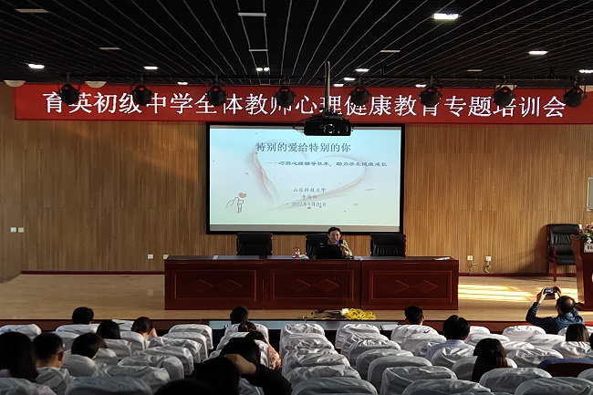 辅导员、校大学生心理健康教育中心咨询师李玲玲走进育英初级中学,为全校近百名教师做了以“特别的爱给特别的你”为主题的心理健康教育讲座。