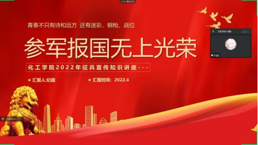 召开大学生应征入伍线上宣讲会,退役复学优秀学生纪超担任宣讲人。宣讲会由满灏老师主持。