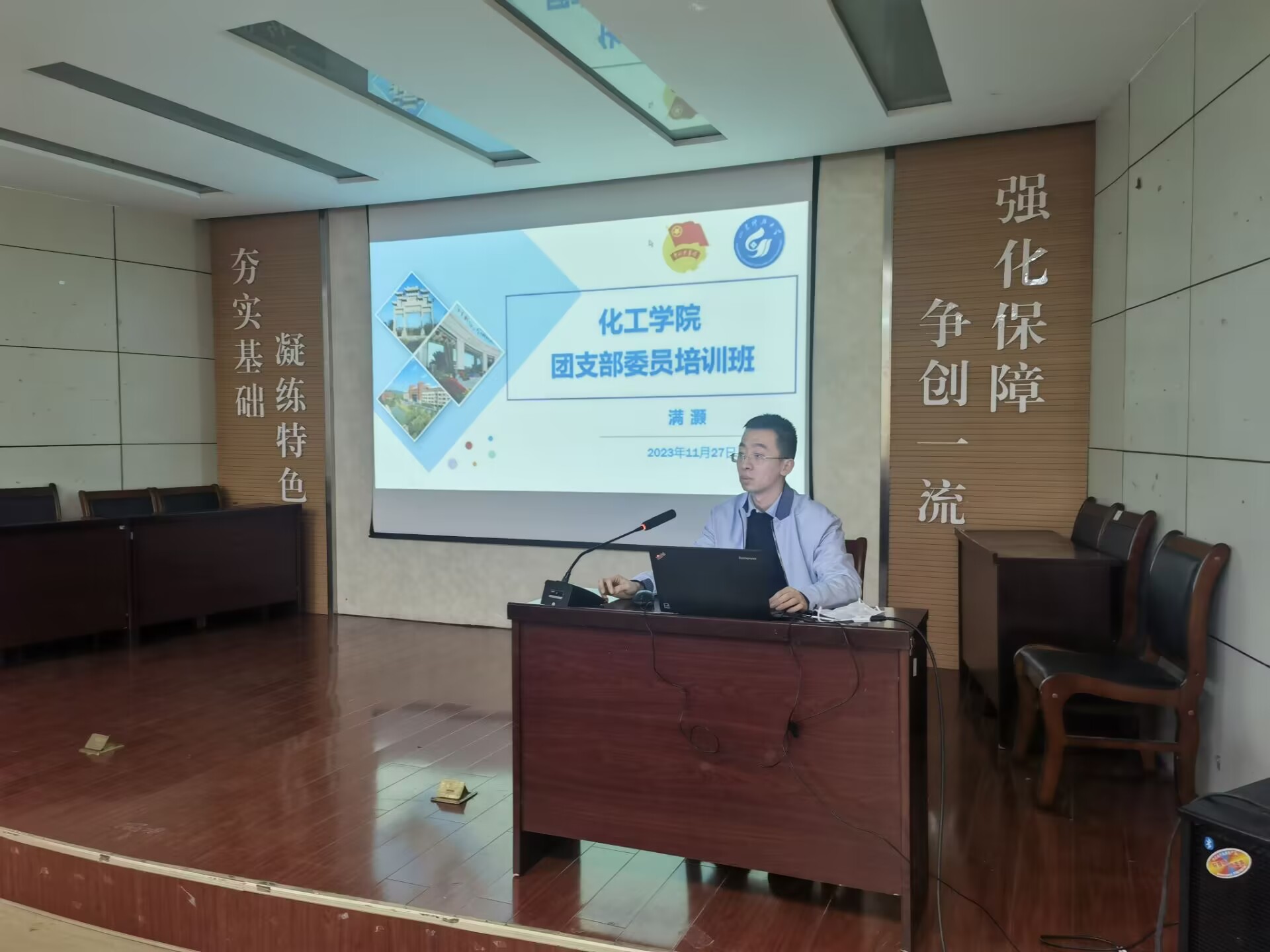 在J2-104举办团支部委员培训班。辅导员满灏担任培训班主讲,结合自身经历以及团支部工作的具体问题,与在场学生进行深入交流并提出针对性方法建议。满灏老师着重讲述了大学生团员心理问题的现状,并介绍了一些应对方法,对保持团员同学心理健康起到了积极作用。最后,全体团支部委员重温入团誓词,进行宣誓,以提醒大家不忘团员的初心,坚定共产主义信仰,牢记共青团员作为党的后备军这一光荣身份,承担自己应有的责任。满灏老师以生动幽默的交流方式,让同学们对团支部委员的要求与任务有了更深入的理解,为未来团支部的发展打下了坚实的基础。