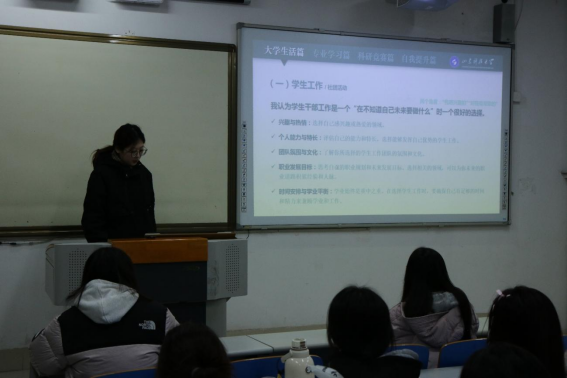 在J1-108举办了“聚合英才,榜样领航”宣讲活动第一讲——“逐梦青春,砥砺前行”,此次分享会由应用化学21-1班团支书王艺涵作为分享嘉宾。