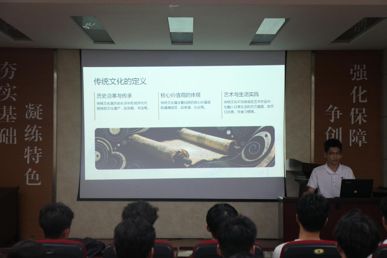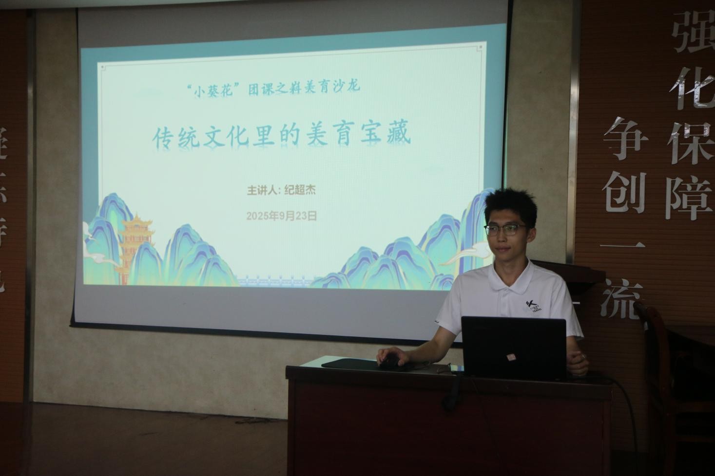 “小葵花”主题团课之嵙美育沙龙在J2-104开班,作为该系列主题团课的第一讲,此次课程的主题是“传统文化里的美育宝藏”,由学生会执行主席纪超杰主讲,全体学生会成员参加。