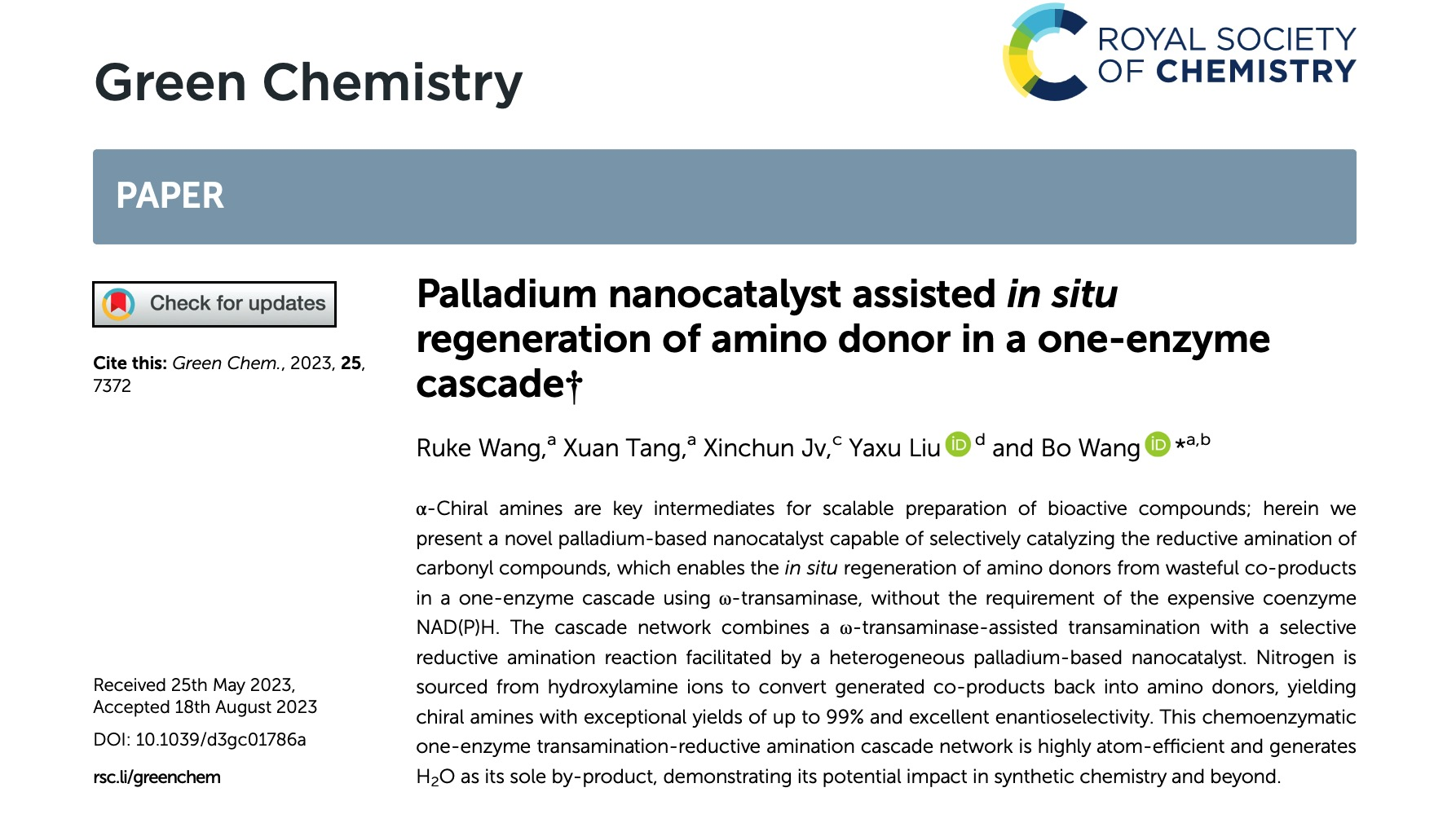 王博教授课题组在转氨酶催化的单酶催化体系领域取得最新进展,成果以Palladium nanocatalyst assisted in situ regeneration of amino donor in a one-enzyme cascade为题目发表在国际著名学术期刊Green Chemistry上,第一作者为狂人小说