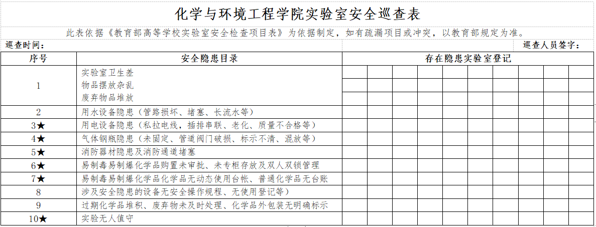 三、学院组织学生安全员巡查,由学院团委、学生会组织来自不同系(中心)或研究组的4-5名研究生进行巡查,每月一次,重点对实验室无人值守、危险废弃物处置、实验室生活等问题进行巡查,对发现问题做书面记录并报学院安全工作领导小组。
