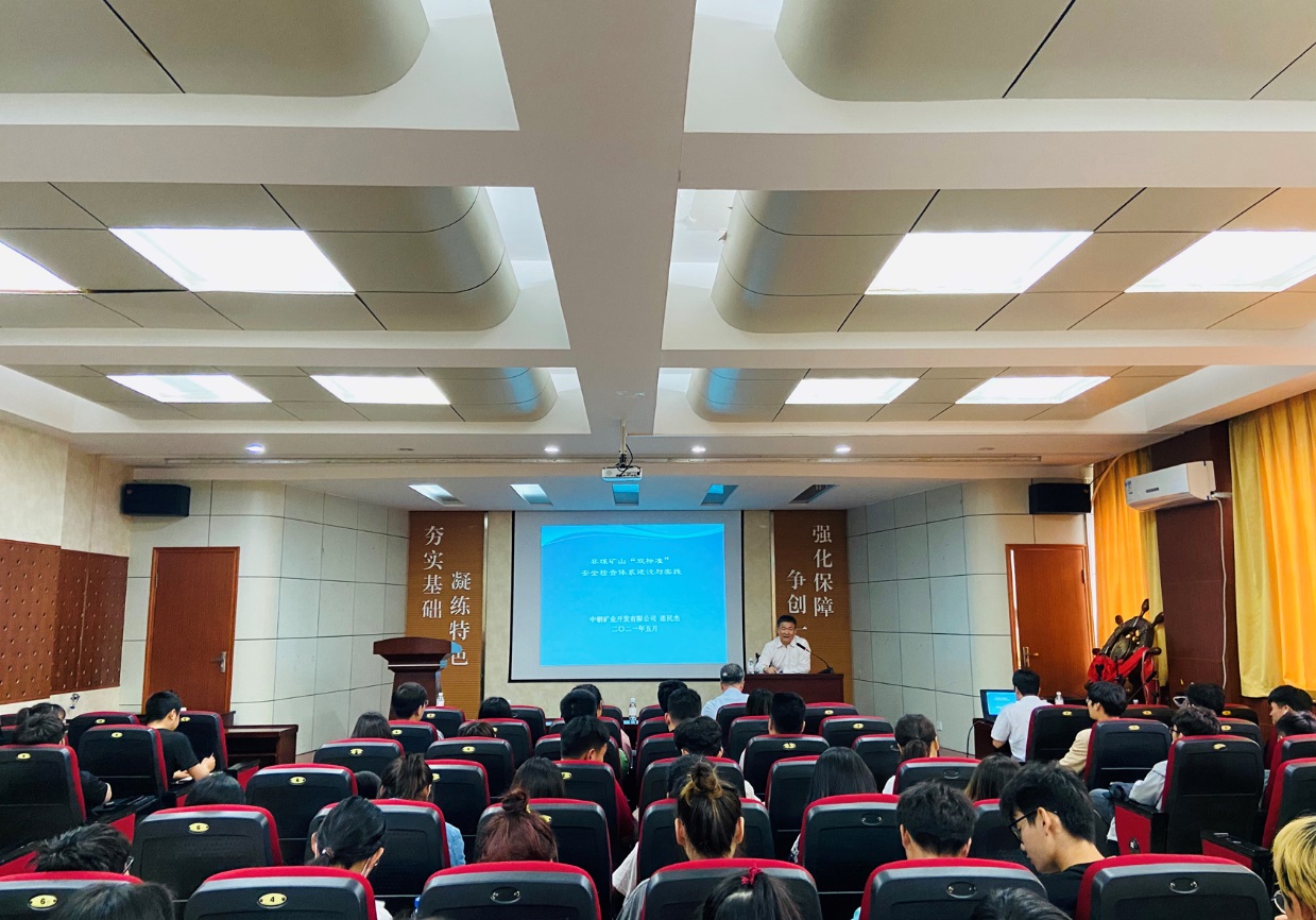 连民杰从国内目前安全生产形势、安全检查方式、“双标准”安全检查体系创建、体系优点以及该体系在中钢矿业的实践等五个方面,阐述了建设与实践非煤矿山“双标准”安全检查体系的必要性。他强调,没有平庸的行业,只有平庸的企业;没有夕阳专业,只有守旧的专业人员;没有最好,只有更好!连民杰结合当前矿业形势,激励同学们树立远大理想,通过艰苦奋斗实现自身价值。