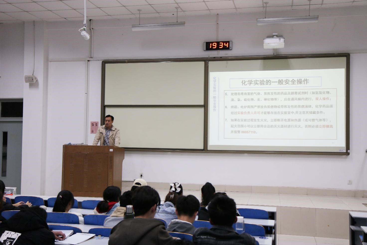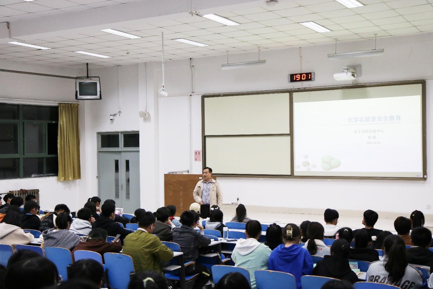 举办以化学实验室安全为主题的安全教育讲座,学院实验中心崔科老师担任主讲,全体2021级新生到场聆听。